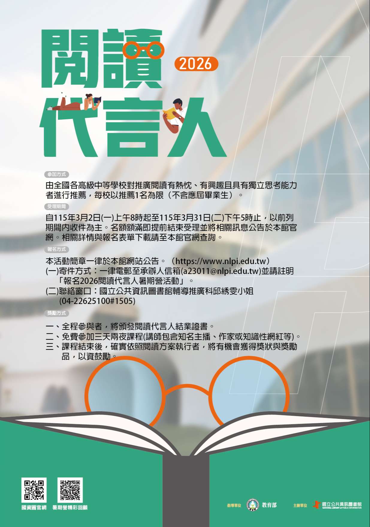 (二)收件方式:一律採電子郵件報名,請於前列期間內將報名資料表、學生證影本及同意書以電子郵件傳送至本館承辦人信箱(a23011@nlpi.edu.tw),名額額滿即提前結束受理。