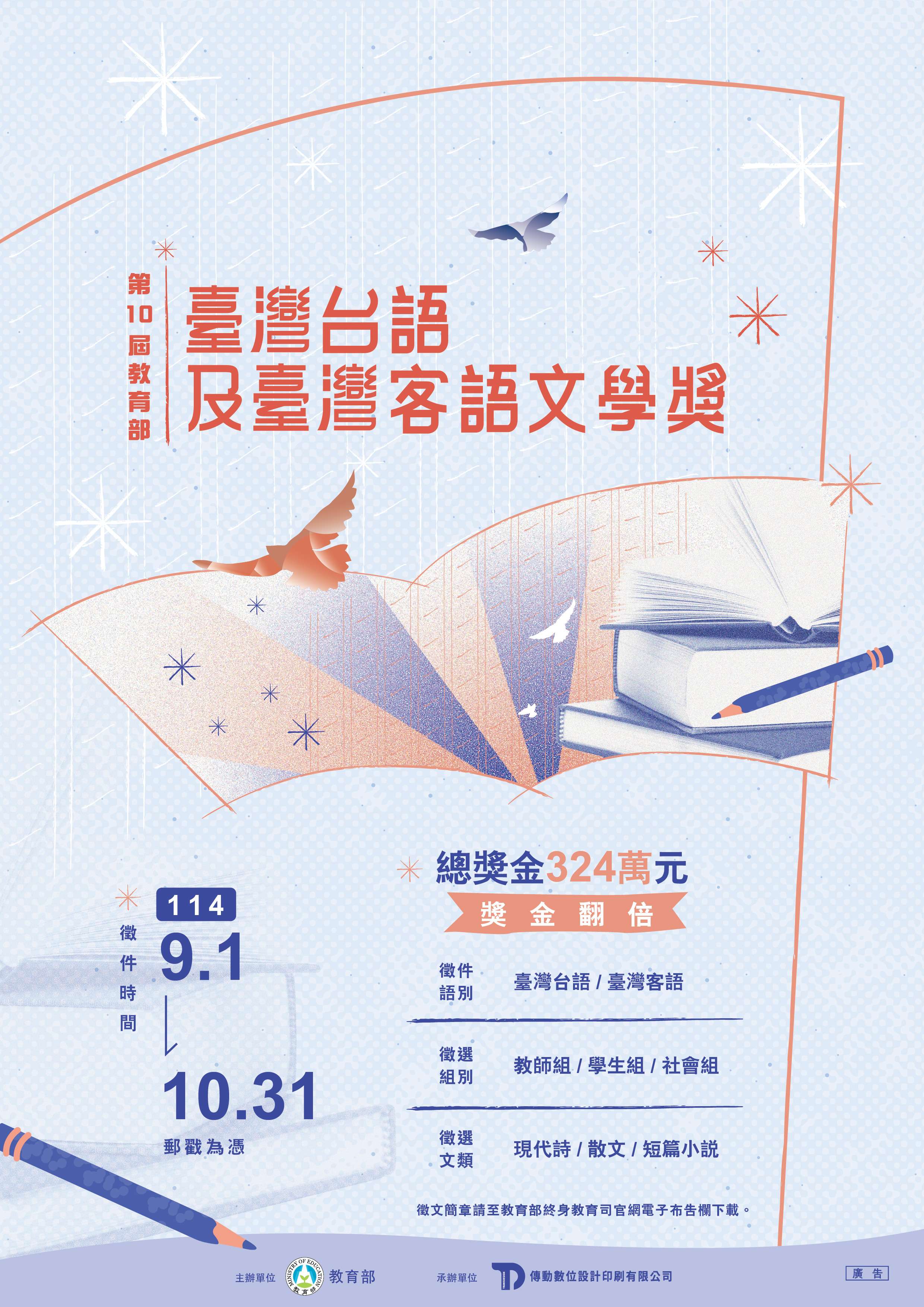 三、旨揭活動徵件日期自114年9月1日起至114年10月31日止,詳情及徵文簡章下載請至教育部終身教育司網站(https://depart.moe.edu.tw/ED2400/Default.aspx)電子布告欄,或電洽:02-8787-5555#123 陳小姐。