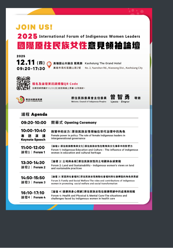 4、論壇3:原住民族女性推動社會福利與社會轉型的角色與貢獻。