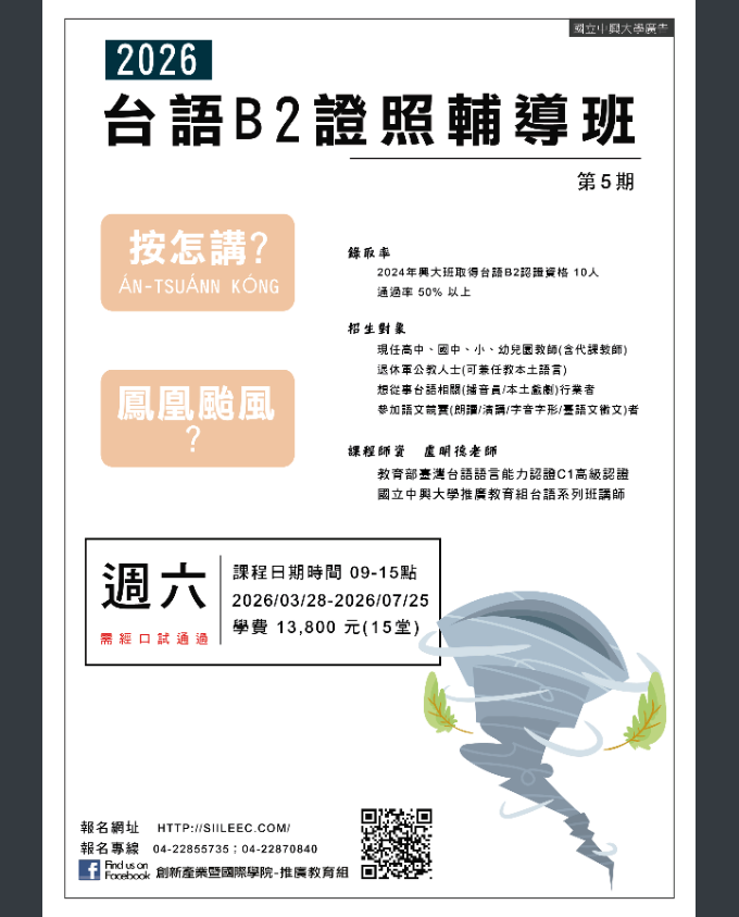 (一)台語B2證照輔導班第4期,2026/03/28-2026/07/25,每週六9-15點,共15次,優惠價13,800元(不含教材與午餐)。 地點:國立中興大學綜合大樓7樓722室。