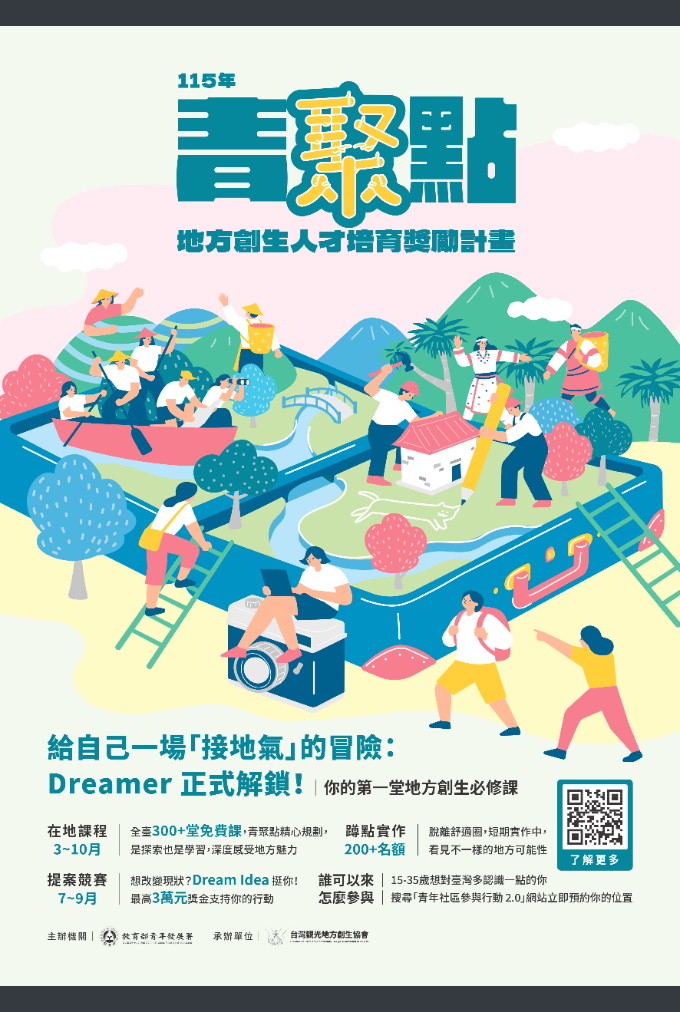 二、前揭在地課程提供15至35歲青年,不限堂數免費參加;另18至35歲青年可報名參與蹲點