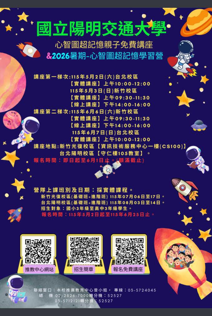 一、旨揭親子免費講座及營隊課程將於臺北陽明校區及新竹光復校區開辦,詳細資訊