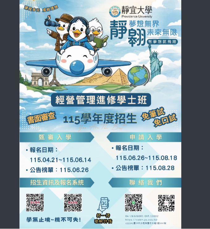 三、有關招生資訊可參閱本校進修學士班招生專區網頁,網址:https://adms.pu.edu.tw/p/426-1123-24.php?Lang=zh-tw歡迎貴校師生多加參考。